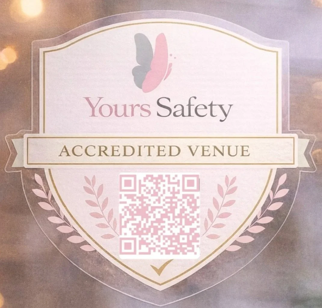 Accredited venues have completed the Yours Safety Training (provided in collaboration with SAFE Alliance) and integrated the Yours Angel Shot System.